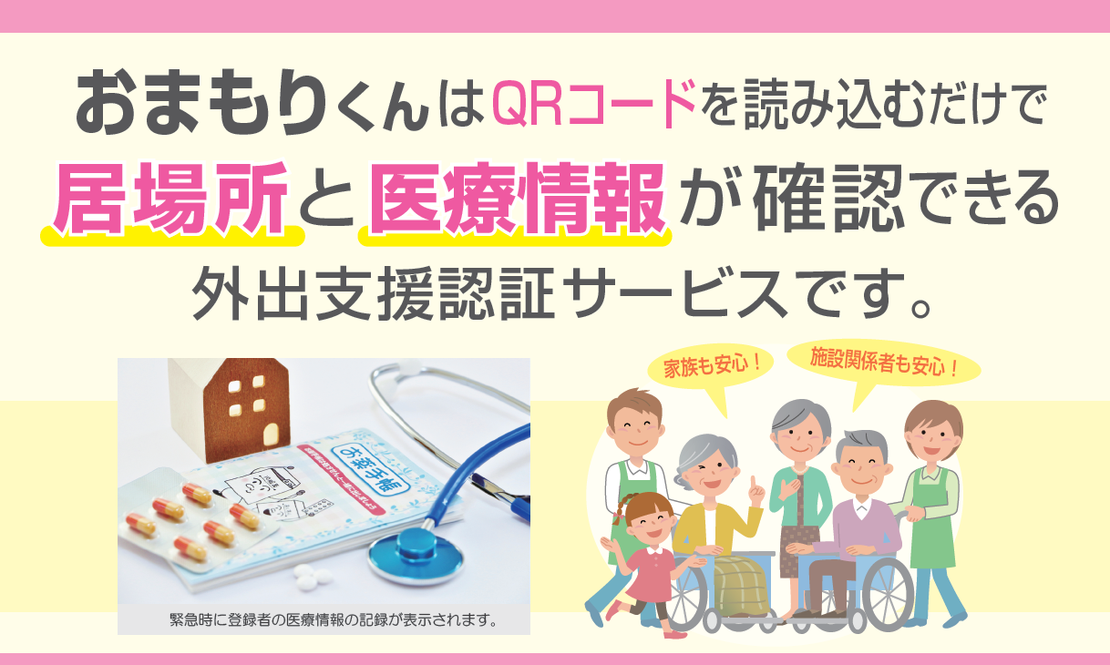 「 おまもりくん」は保護した人がスマートフォンでQRコードを読み込むことで「メディカル情報/服薬情報」がその場で確認でき、家族や登録された緊急連絡先に「状態や位置情報」などが通知される安否確認システム(外出支援認証サービス)です。